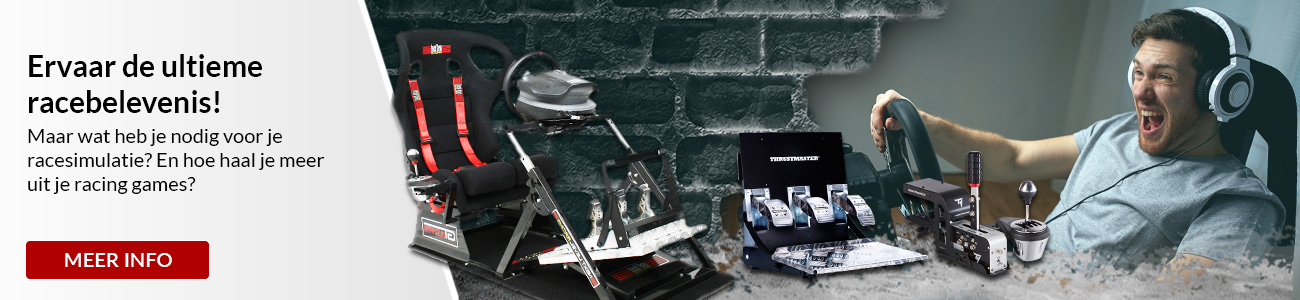 Jij kunt nu hetzelfde ervaren als onze Max! Maak jouw race ervaring zo compleet en realistisch mogelijk met een complete setup. Zo zijn er racesturen met Force Feedback-technologie, gaspedalen, handremmen en shifters. Hiermee kun je het race-avontuur zo realistisch mogelijk beleven, net alsof je écht op het circuit rijdt.