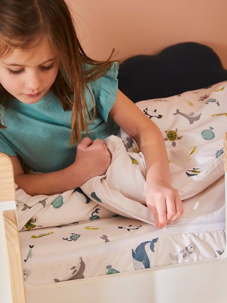 Een vrolijke dekbedovertrek met grappige print in zeedieren-thema, waar kinderen zich gemakkelijk in kunnen inritsen! Plaats de hoes op het matras, de dekbedhoes rits je eraan vast. Plaats je deken (niet meegeleverd) in de hoes. Het kind hoeft alleen maar aan de rits te trekken om goed ingestopt te zijn.